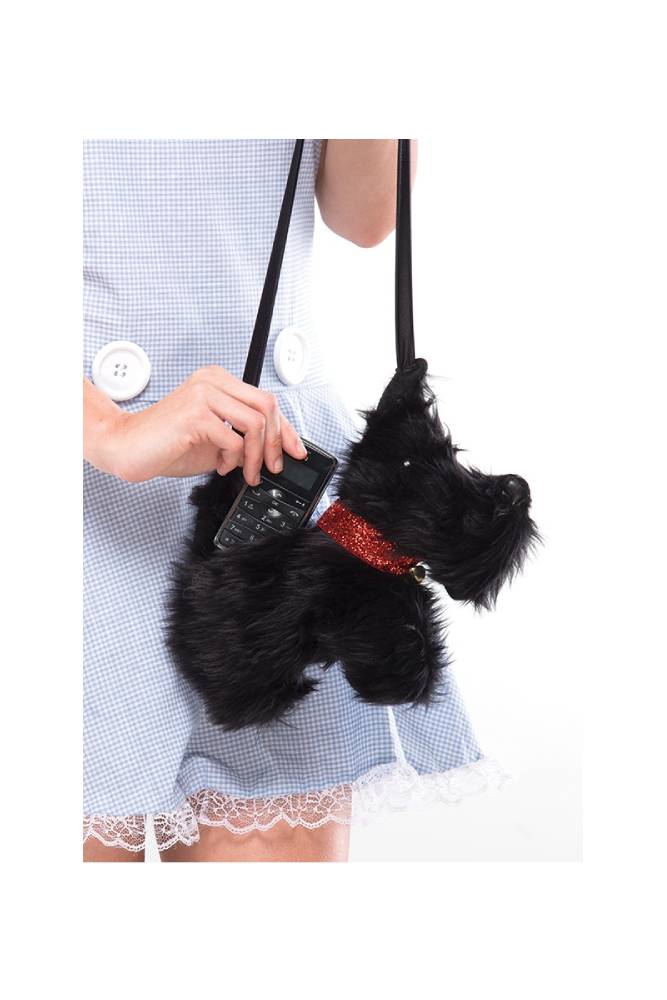 Follow the yellow brick road in this gingham and stretch lace dress with gathered sleeves, collar and lace trimmed hem. Dress features Lycra back panel and back neck keyhole with button closure. Costume includes faux fur dog purse with sparkly collar and button eyes and headband with sequin bow.