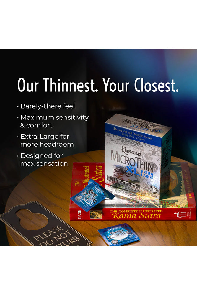 Although not quite as long as other XL condoms, the Microthin XL is quite wide, coming in at a reputable 4.4' inch circumference. Sheer Size, sheer pleasure, sheer safety, these Kimono Microthin XL condoms are 38% thinner than standard condoms and crafted to exacting standards of quality for over 30 years, these XL Extra Large Kimono condoms have earned the Crown of the 'Thinnest Extra Large Latex Condom'. Through advanced latex engineering FDA and ISO specs are exceeded time after time. Kimono Microthin XL are lubricated without spermicide.