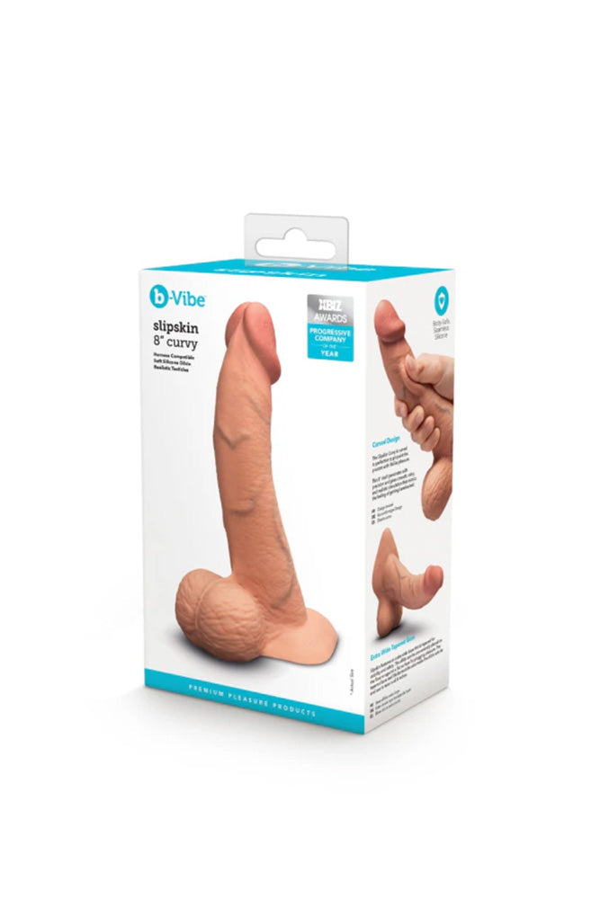 Experience lifelike pleasure with the b-Vibe Slipskin Curvy Realistic 8" Silicone Dildo. Its pressure-reactive silicone moves naturally for an ultra-authentic feel, while delightfully curvy contours target G-Spot and P-Spot stimulation. Detailed with raised veins, a realistic head, and full balls, it enhances both visual and tactile enjoyment. Safe for anal play thanks to its extra-wide tapered base, and crafted from premium, non-porous, phthalate-free silicone for worry-free fun. Comes with a discreet carrying case, making it perfect for solo adventures or playful partner moments on the go.