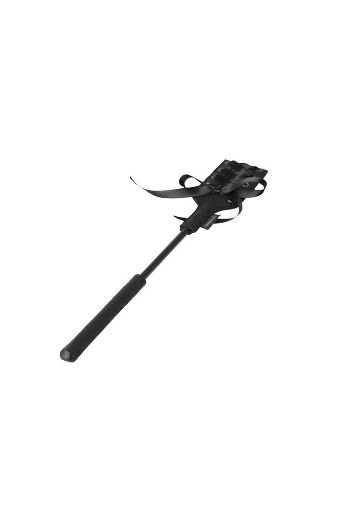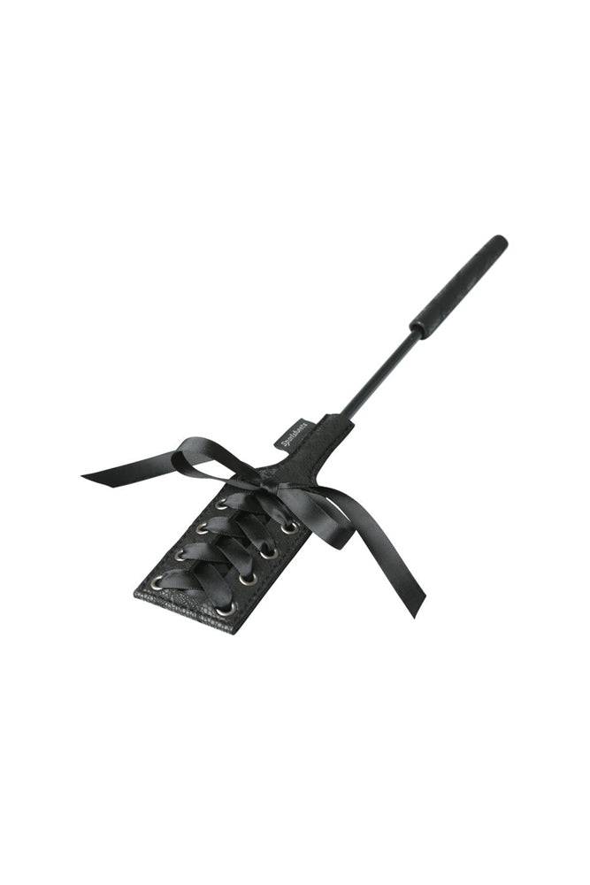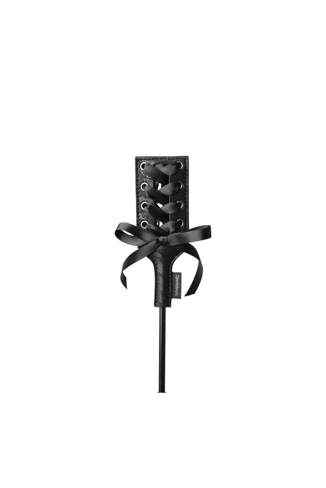 Covered in a luxurious lacy fabric, the head of this stylish, sleek crop is set off with a lavish black corseted ribbon and satin bow. The stem is made of a thin yet sturdy rod while the handle is covered at the base with the same lacy fabric.