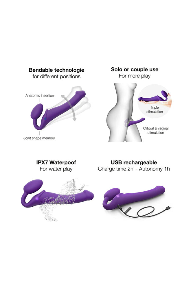 The reinforced power of its 3 independent motors, the intuitive remote control, the liquid silicone material for an ultra-supple and soft touch combined with the elegance of its clean lines make the new Vibrating Bendable Strap-on the essential accessory for unparalleled experiences.