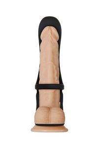 Two soft and stretchy loops rein in the balls and shaft while the penis is supported along the top, seamlessly creating more insert-able width for satisfying penetration.